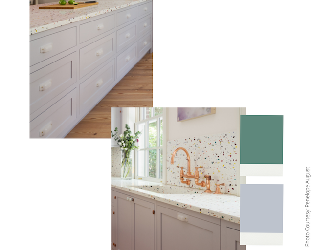 Go bold! If the rest of your home has an open and airy feel, don’t shy away from bolder colors for cabinets. We love Surf Green which encapsulates the green of our Hawaiian waters, but this kitchen in a color similar to Daydream is absolutely stunning. Don’t even get us started on the terrazzo!