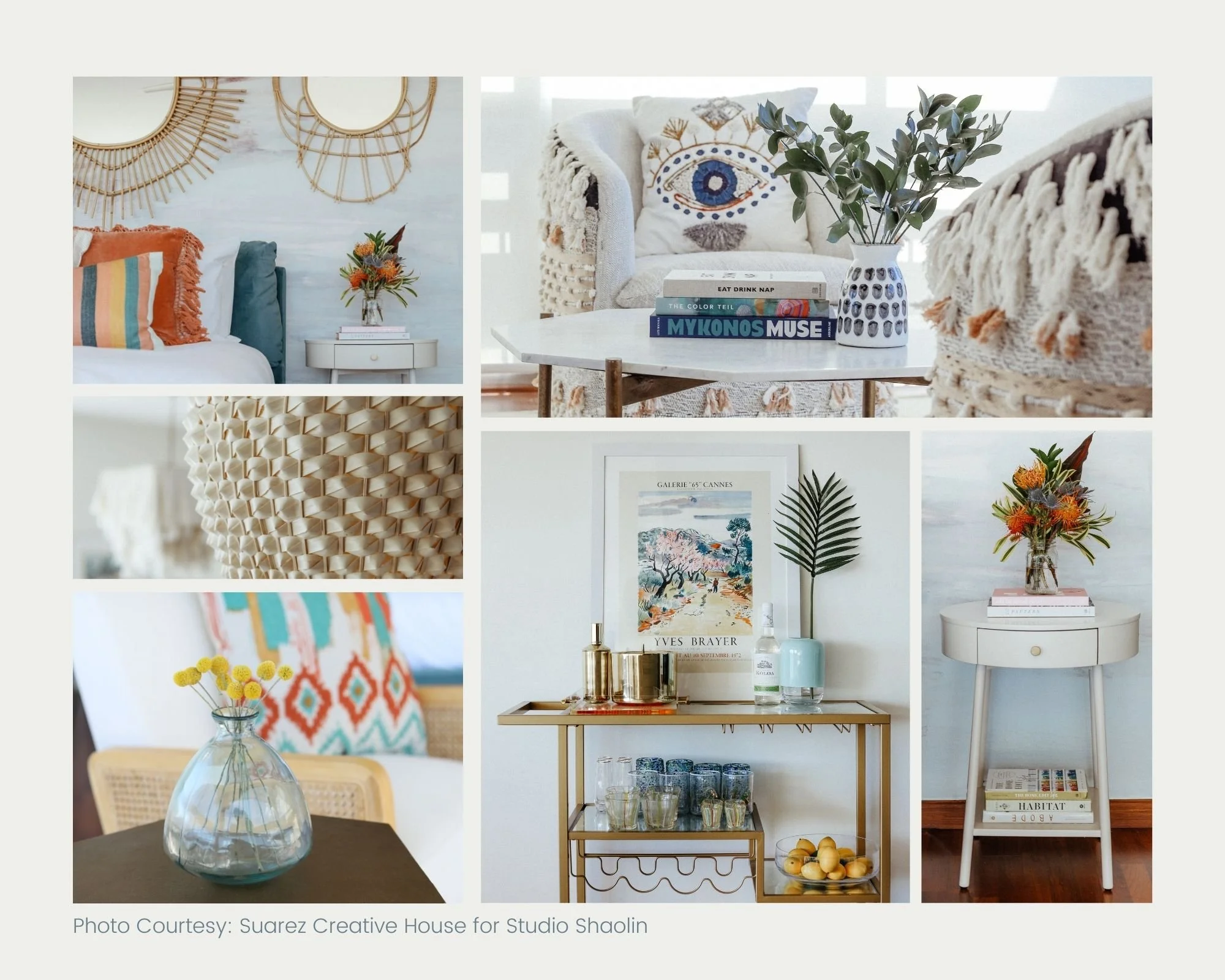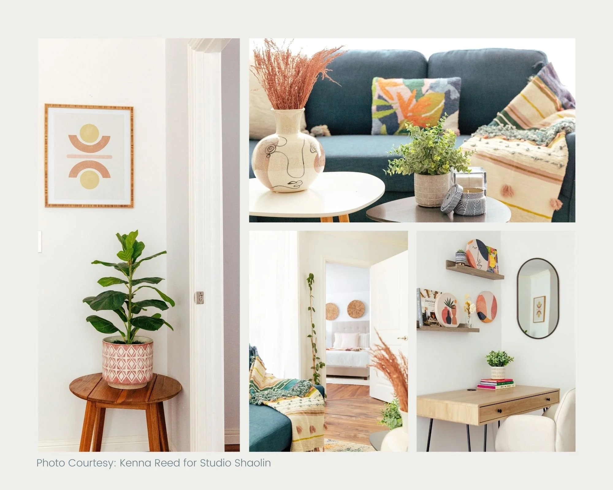 The best aspect about this style is that eclectic is what you make it. Take all of these tips to your discretion and go as crazy as you like! Our most recent project, Prospect Street, has a combination of our suggestions with some of that Shaolin flare. The living space had a mix of fringe, sequins, and ceramics, styled coffee table books and greenery, while the bedroom had a mix of rattan, tassels, and wallpaper… and voilà eclectic boho style vibes were everywhere!
